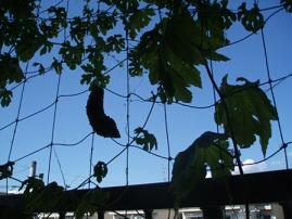 今年は植えるつもりはなかった。ゴーヤに替えて朝顔の種をまいた。その朝顔も芽が二つしか出ず、その発芽後数日して変な形の芽だ出てきたのだった。昨年に育てたゴーヤの種が落ちて、プランターの土の中に残っていたのだろうと想われた。朝顔は花を咲かせることは全くなく、ゴーヤはといえば、小さな黄色い花は咲かせるが、受粉したであろうと想われるものも膨らむことはなく、(これは受粉しなかったから?…)スッカリ諦めていた頃に、一つだけが徐々に膨らみ始めたものだから、私の関心を大いに惹きつけたのであった。